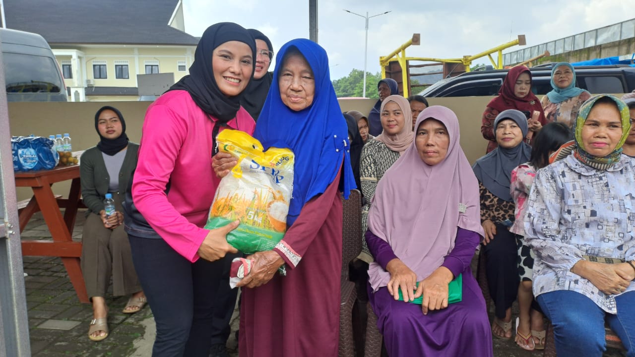 Ketua Cabang Bhayangkari Polres Sumedang Linda Joko Dwi Harsono membantu masyarakat untuk mendapatkan beras dengan harga murah pada bazar murah digelar bekerjasama dengan pihak Bulog Sumedang. (Ist)