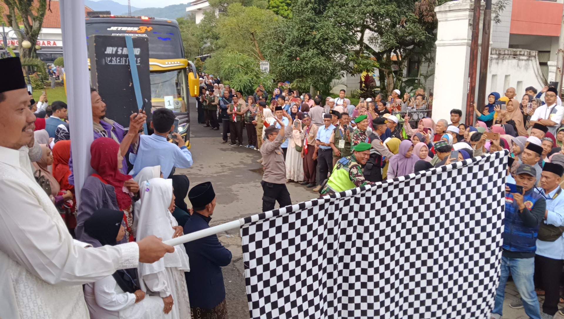 JABAR MEMANGGIL-Sebanyak 445 calon jamaah haji asal Kabupaten Sumedang yang tergabung dalam kloter 3 di berangkatkan di halaman Gedung Negara Sumedang dengan menggunakan 11 armada bus.