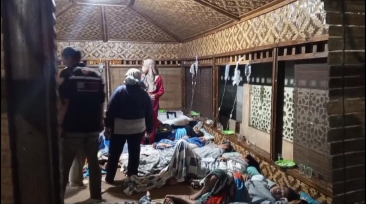 Para santri tampak terbaring lemas di aula pesantren, sementara sebagian lainnya harus dievakuasi ke rumah sakit untuk mendapatkan perawatan intensif.