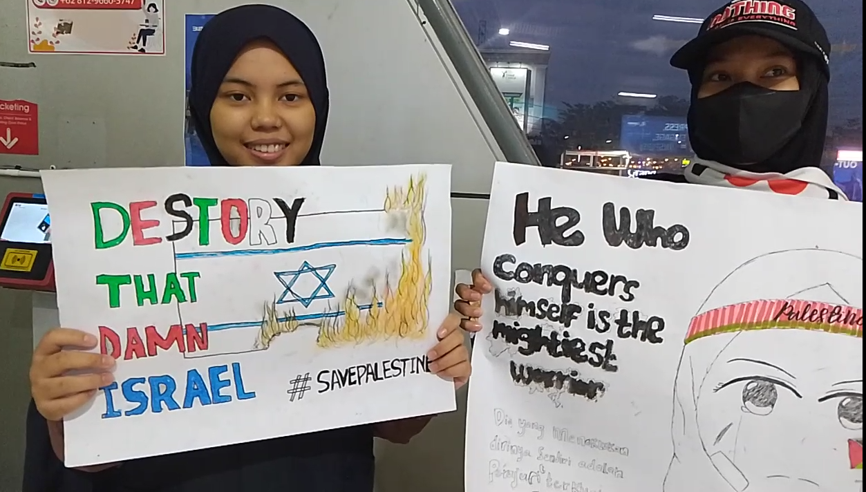 Dalam semangat mendukung Palestina, para peserta aksi mengenakan atribut yang menggambarkan Bendera Palestina. Mereka tampak penuh antusias dalam menyuarakan penolakan terhadap penjajahan yang dilakukan oleh Zionis Israel terhadap Rakyat Palestina.